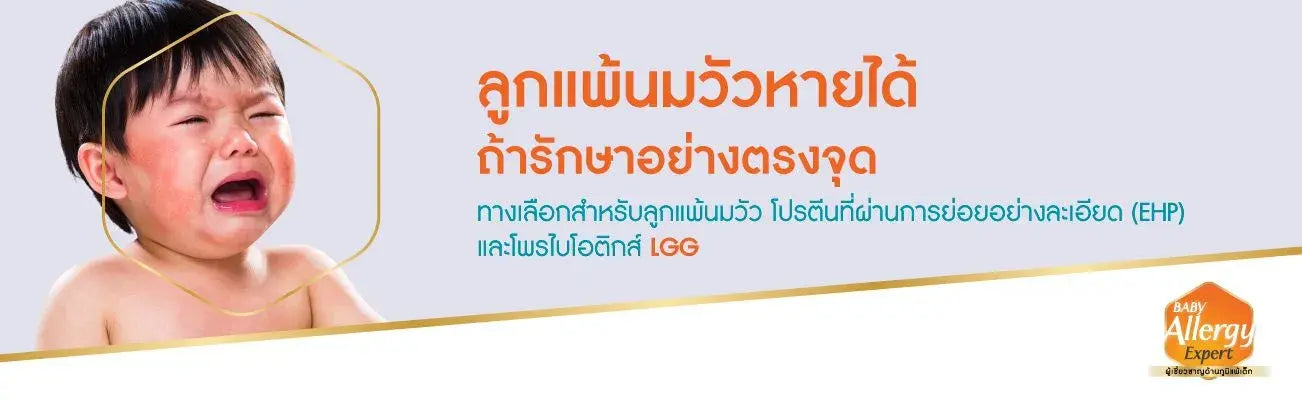 ในกรณีที่คุณแม่มีน้ำนมไม่พอหรือไม่สามารถให้นมแม่ไม่ได้ ควรปรึกษาแพทย์ผู้เชี่ยวชาญ ซึ่งแพทย์มักแนะนำ “โปรตีนที่ผ่านการย่อยอย่างละเอียด* (EHP)” โปรตีนนมขนาดเล็กที่มีคุณสมบัติ Hypoallergenic ไม่ก่อให้เกิดอาการแพ้ และอาจมีโพรไบโอติกส์ เช่น LGG ซึ่งช่วยสร้างภูมิคุ้มกันให้แข็งแรง เพื่อหยุดอาการแพ้นมวัว รวมถึงลดโอกาสเกิดภูมิแพ้อื่น ๆ ในอนาคต