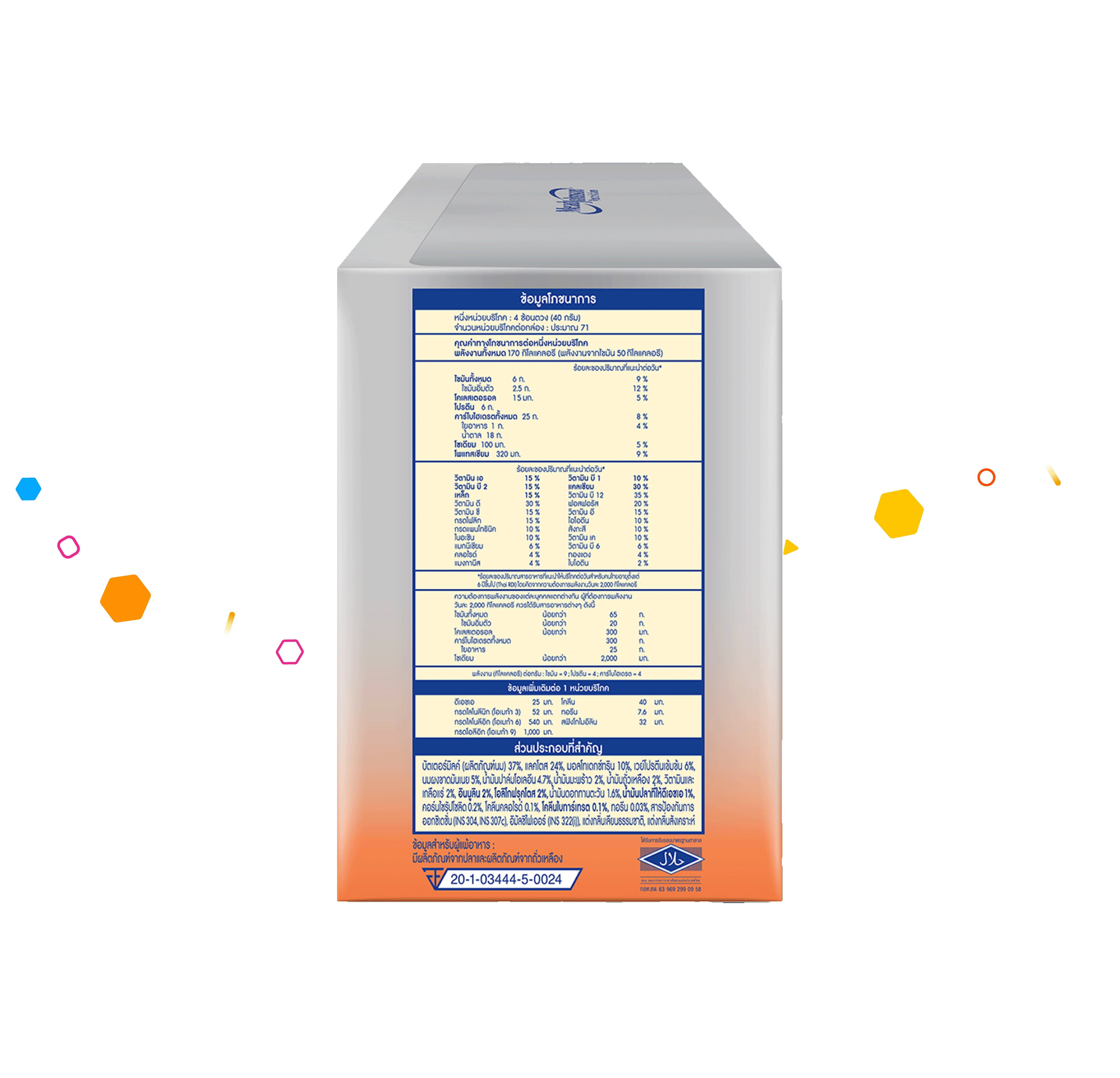 - สูตรผสมใยอาหาร 2 ชนิด โอลิโกฟรุคโตส และ อินนูลิน รวมปริมาณ 1,200 มก. ต่อหน่วยบริโภค